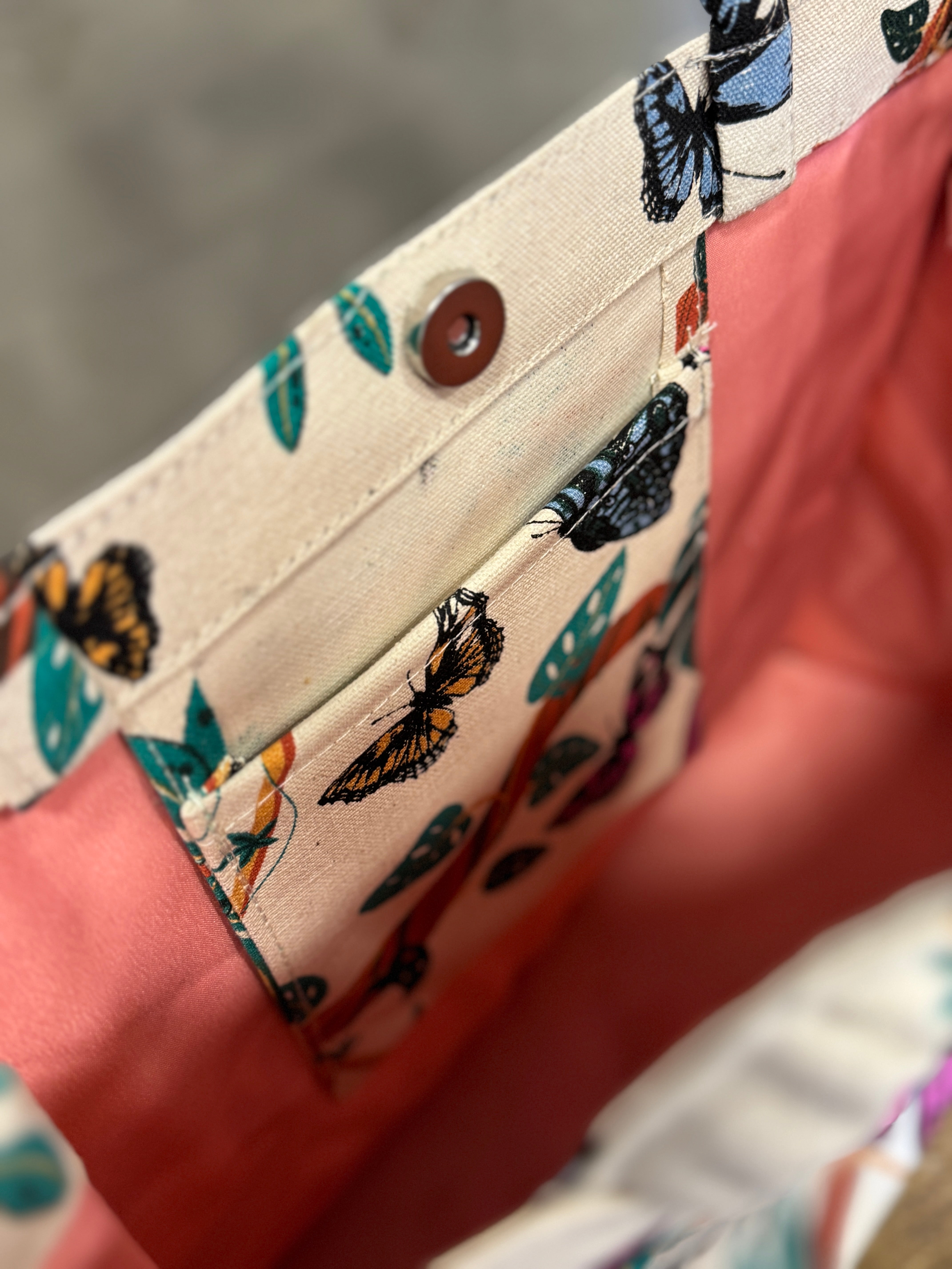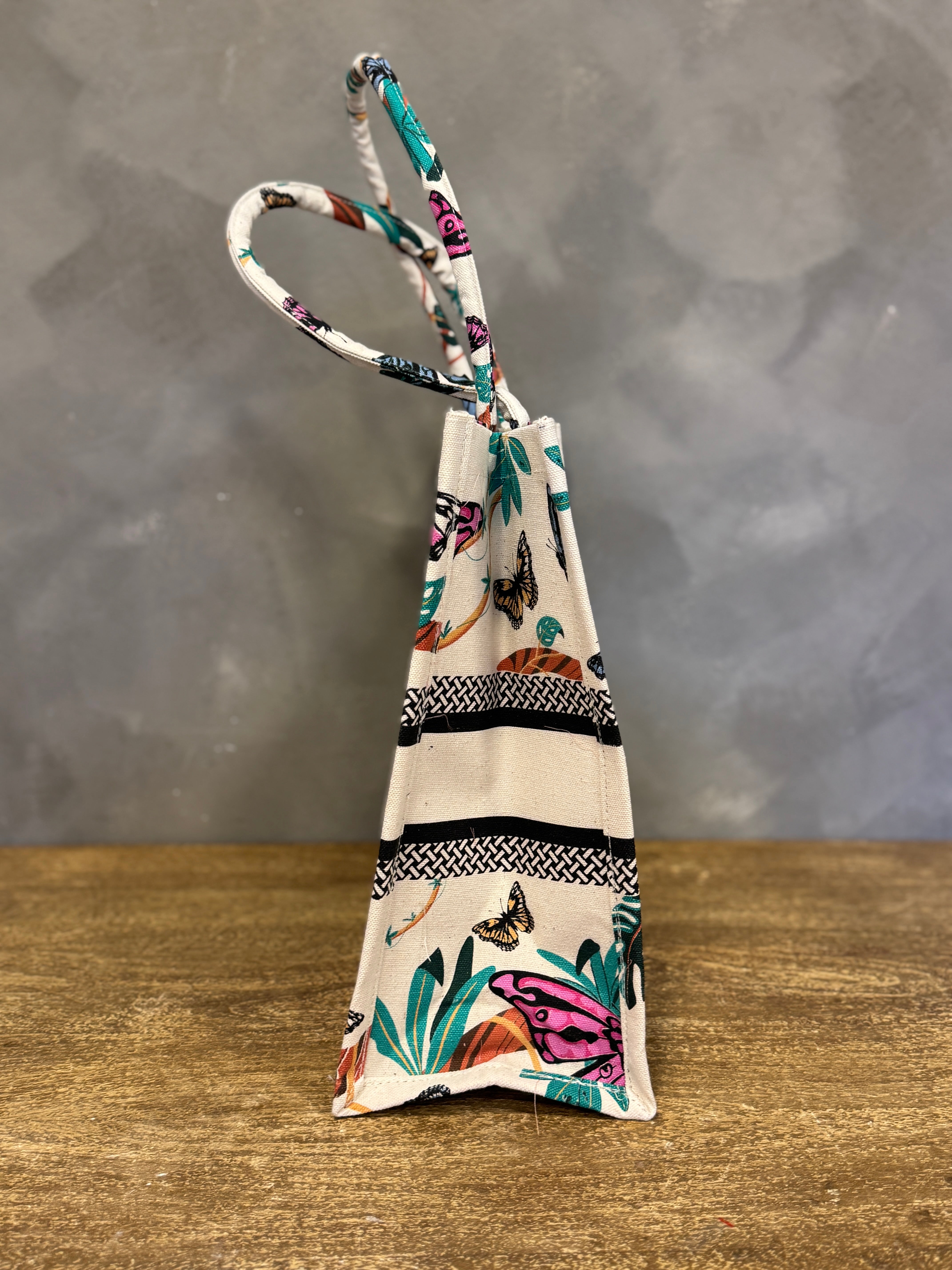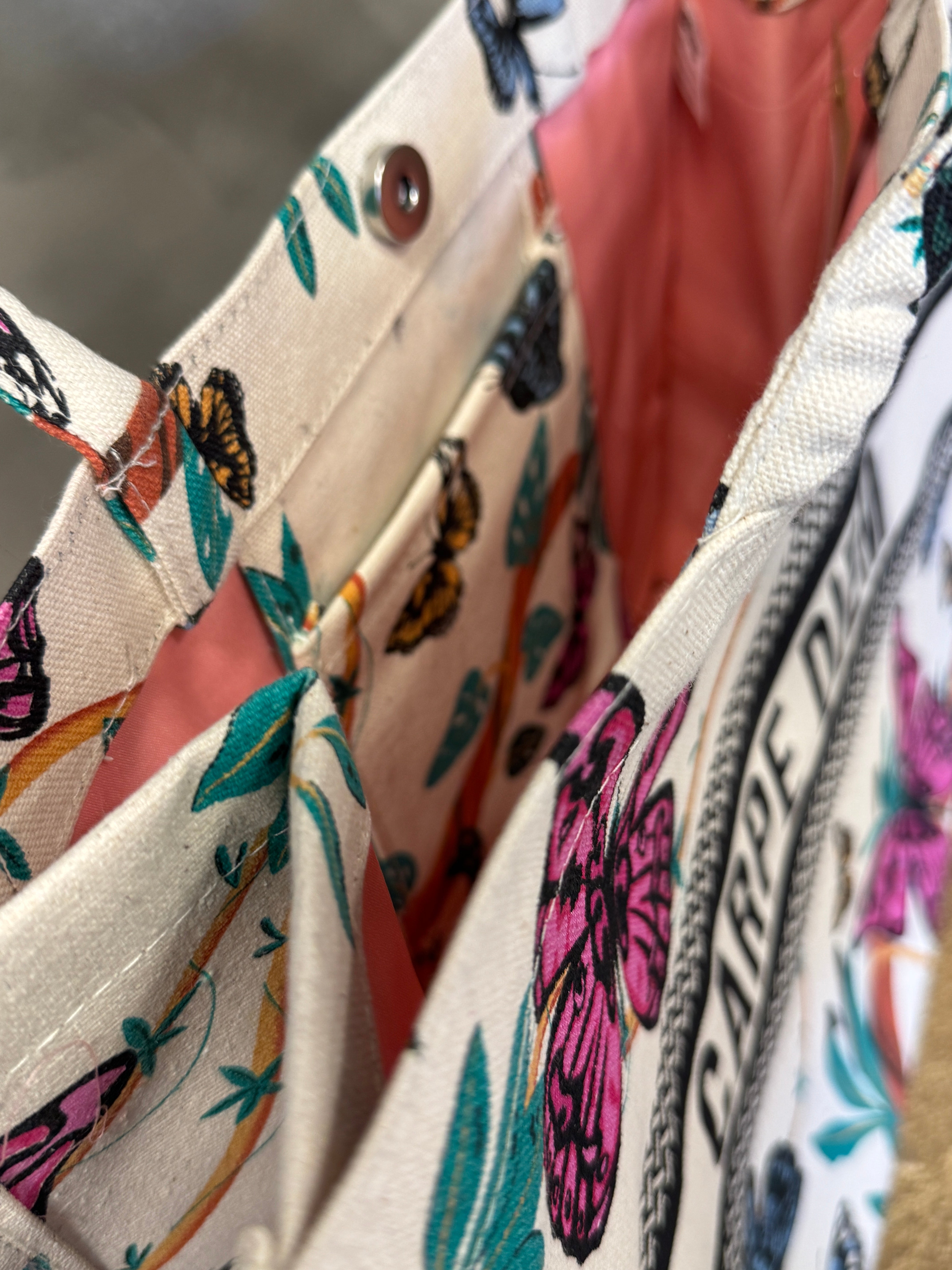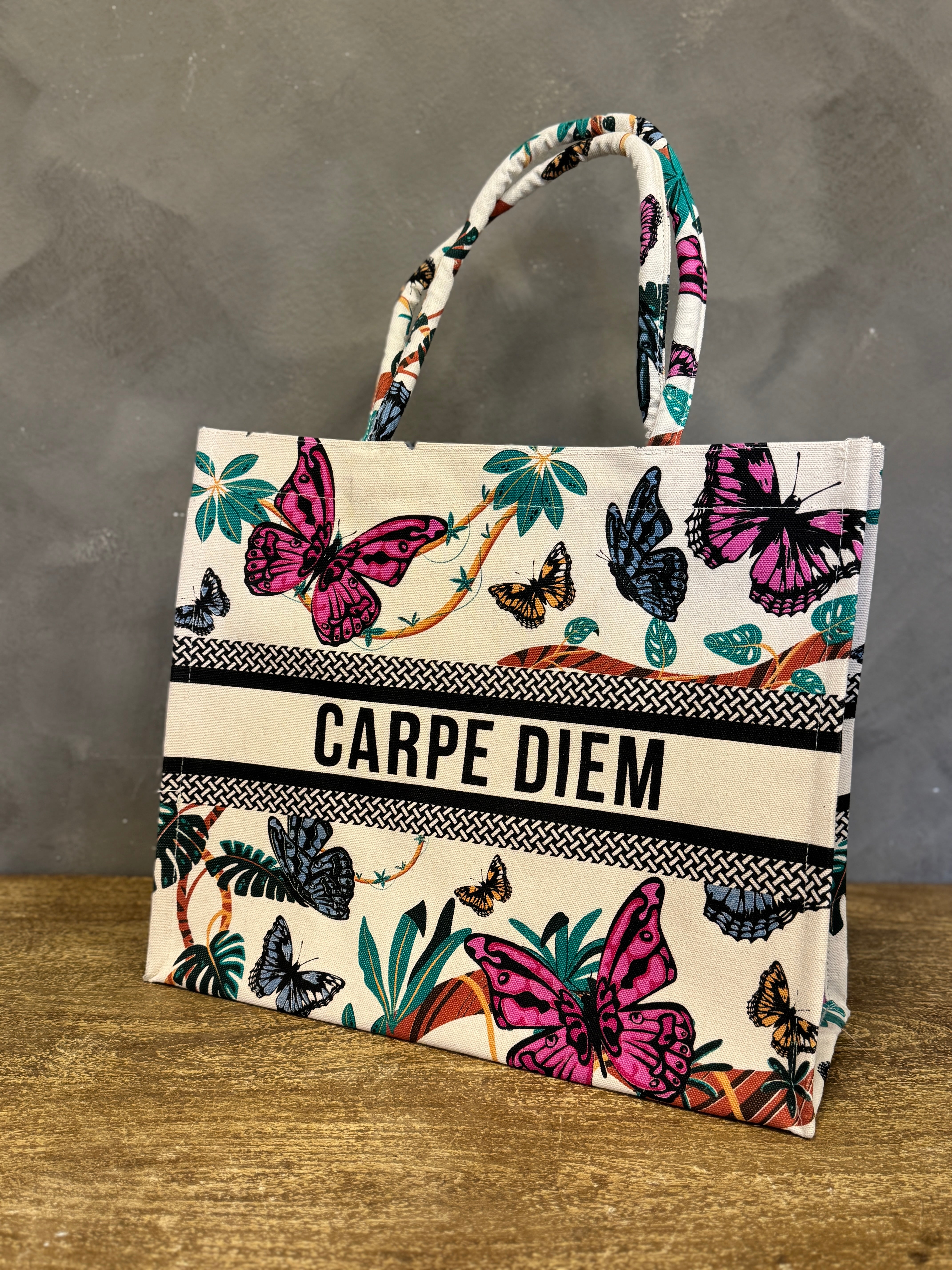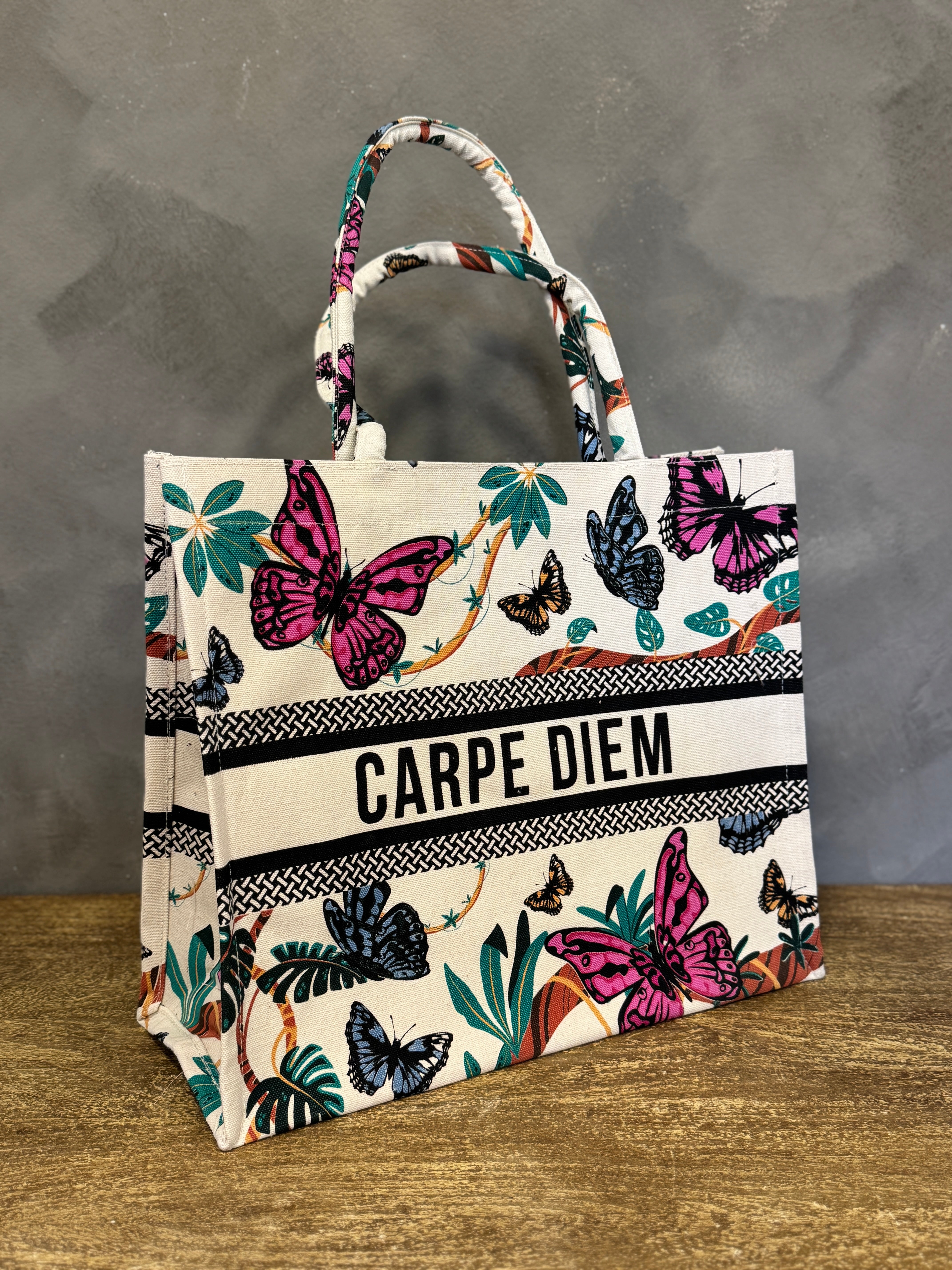 Met de Carpe Diem tote bag wordt elke dag een uitnodiging om het moment te grijpen. Deze handgemaakte tas straalt optimisme uit met haar frisse witte basis en een vrolijk patroon van vlinders en bloemen. Een zomerse blikvanger die licht en luchtigheid brengt – perfect voor een spontane picknick, een middagje shoppen of een dag op het strand.