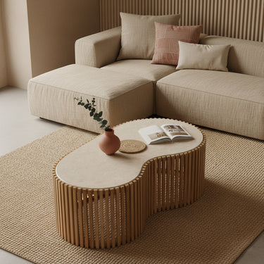 Marmeren salontafel met Sungkai-houten onderstel uit de Infinity-collectie. Uniek marmerblad met natuurlijke tekening, lichte warme houttinten en tijdloos design. Volledig gemonteerd geleverd; eenvoudig te combineren en onderhoudsvriendelijk - een elegant, duurzaam middelpunt voor uw interieur.