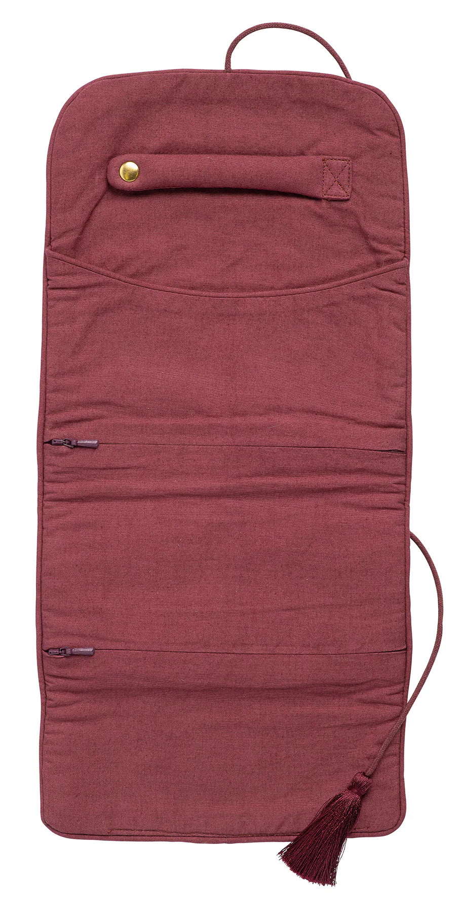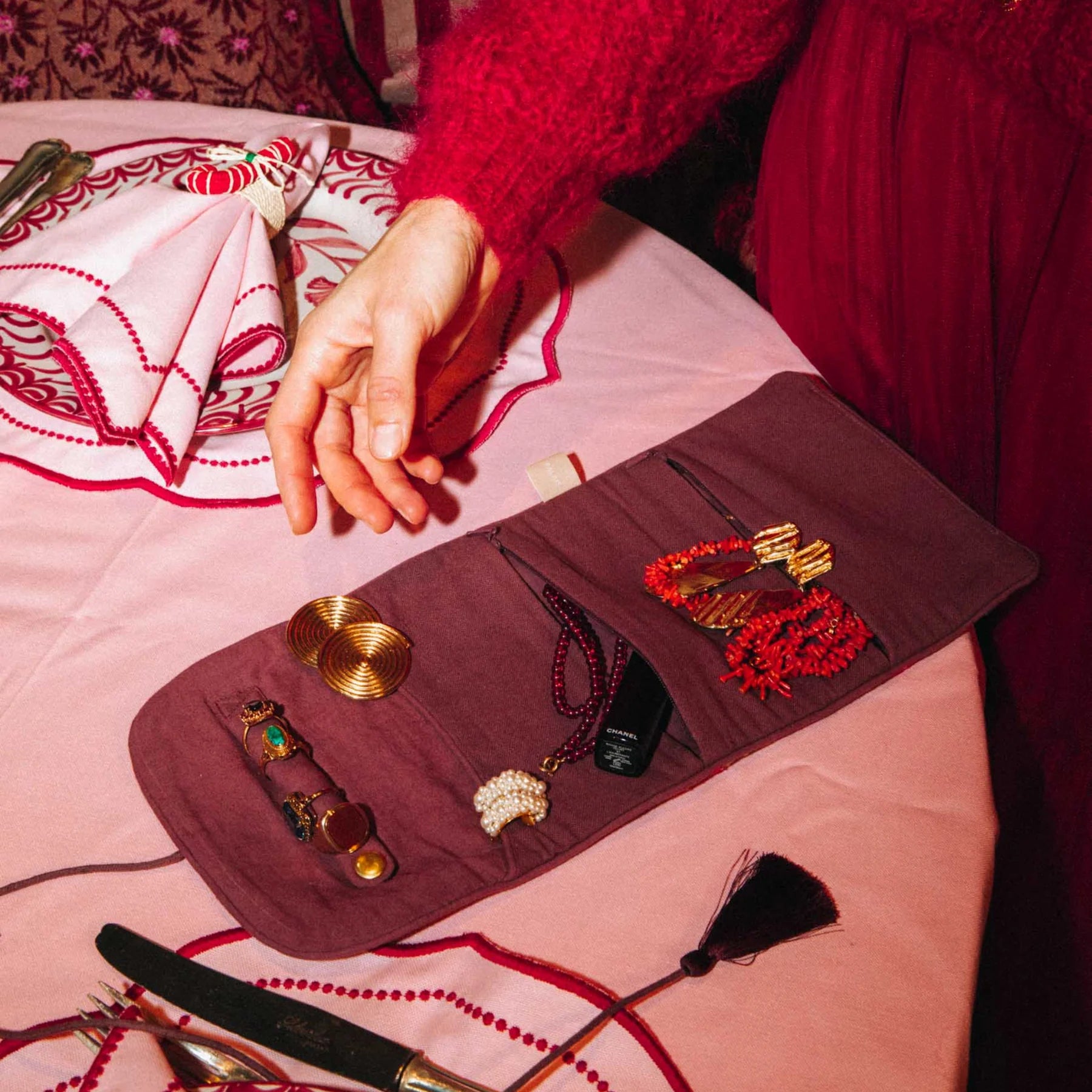 Een ode aan verfijnde luxe. Het sieradentasje Audrey van Palais, nu te vinden bij Celebra la Vida, straalt tijdloze elegantie uit met zijn diepe bordeaux tint en zachte saliegroene details. Een prachtig geborduurd accessoire dat niet alleen je sieraden bewaart, maar ook je dagelijkse ritueel net dat beetje extra charme geeft.