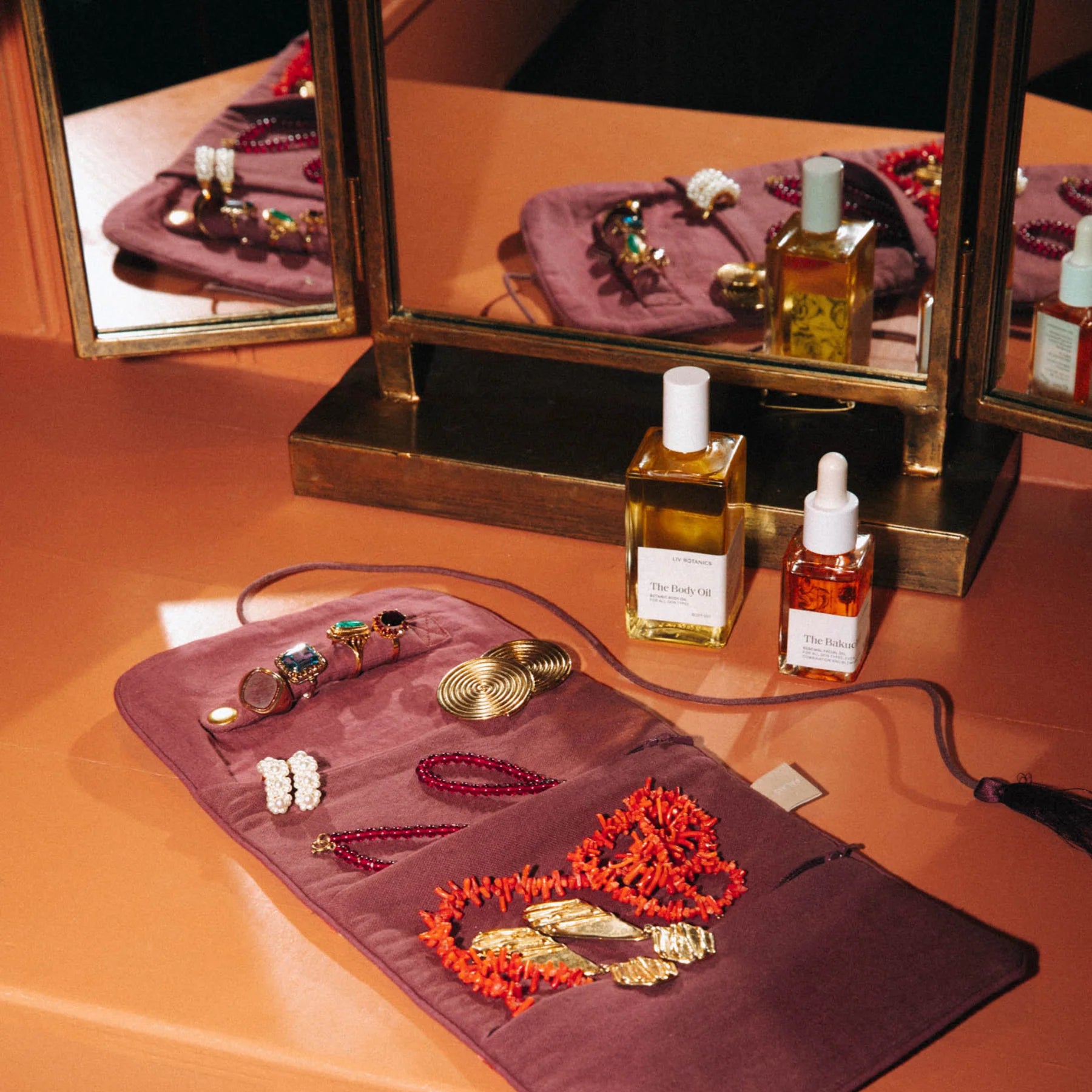 Binnenin ontdek je een slim ontworpen indeling waarin ringen, armbanden, oorbellen en kettingen veilig en overzichtelijk opgeborgen blijven. Geen knopen, geen losse stukjes, maar een serene plek waar elk sieraad tot zijn recht komt. Ideaal voor in je koffer tijdens een reis, in je weekendtas of elegant opgeborgen in je lade thuis. Het Audrey tasje voelt als pure zorg voor je mooiste spullen.