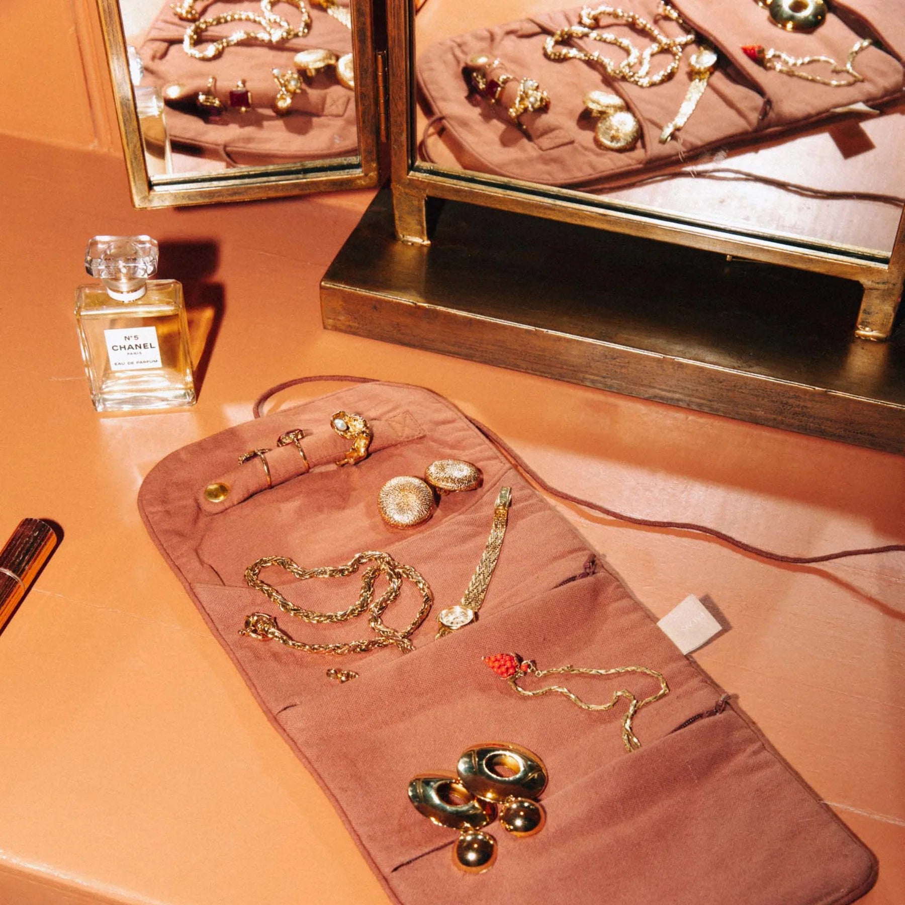 Binnenin vind je doordachte vakjes en bevestigingen die je sieraden veilig en overzichtelijk opbergen. Ringen blijven op hun plek, kettingen raken niet in de knoop en kleine treasures krijgen hun eigen zachte thuis. Een tasje dat niet alleen functioneel is, maar je elke keer opnieuw een moment van luxe geeft.