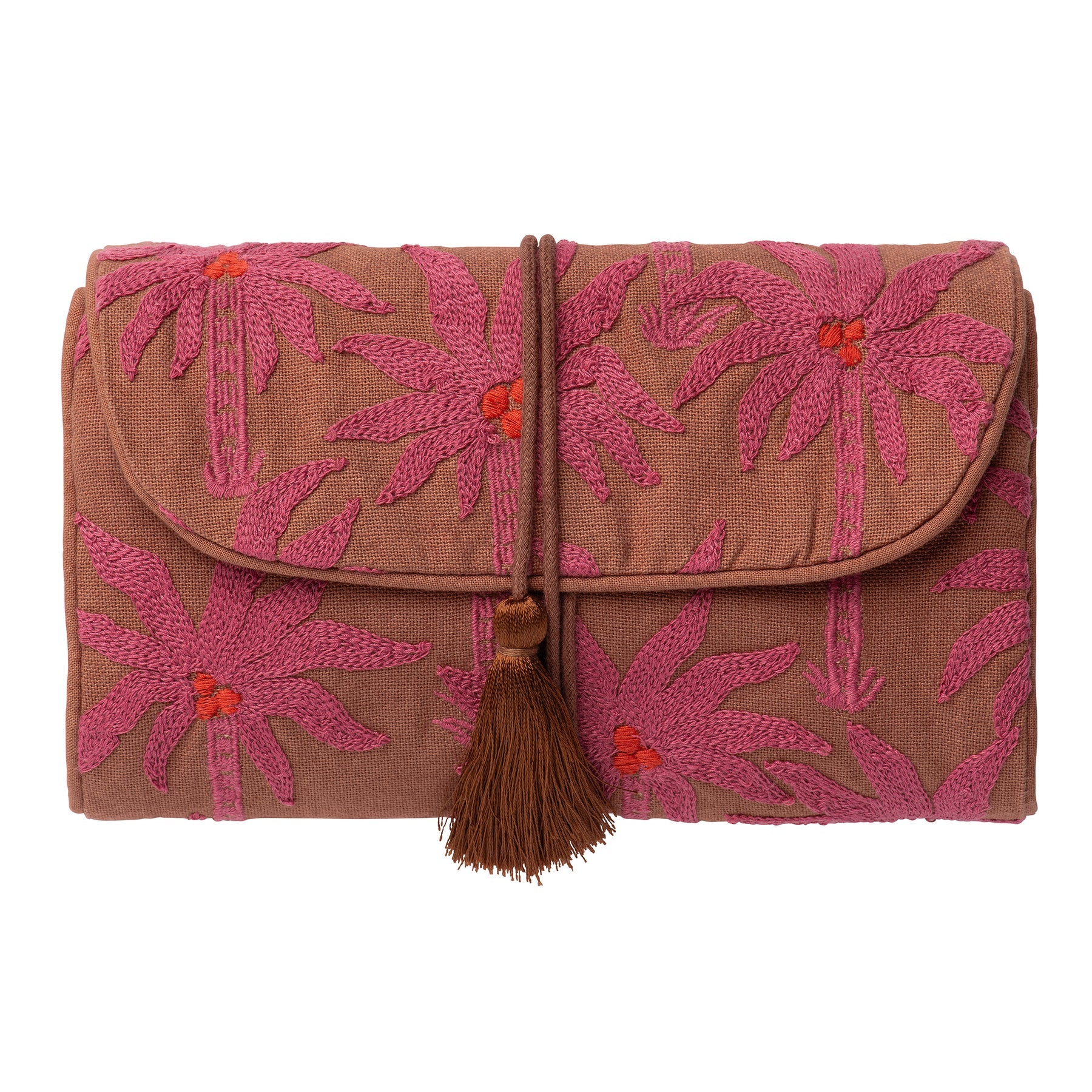 Een vleugje elegantie voor onderweg. Het sieradentasje Laura van Palais, nu verkrijgbaar bij Celebra la Vida, omarmt luxe in zijn meest verfijnde vorm. Prachtig geborduurd, met een warme spice-tint en fuchsia-accenten, straalt dit tasje pure verfijning en vakmanschap uit.