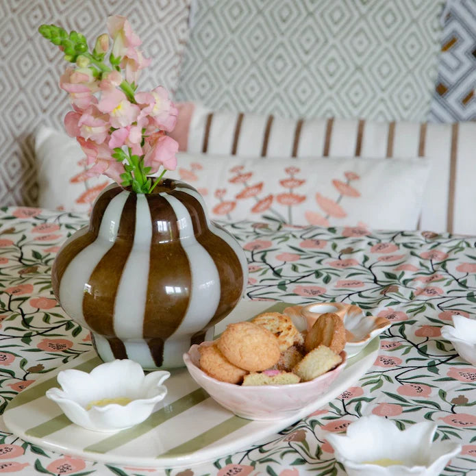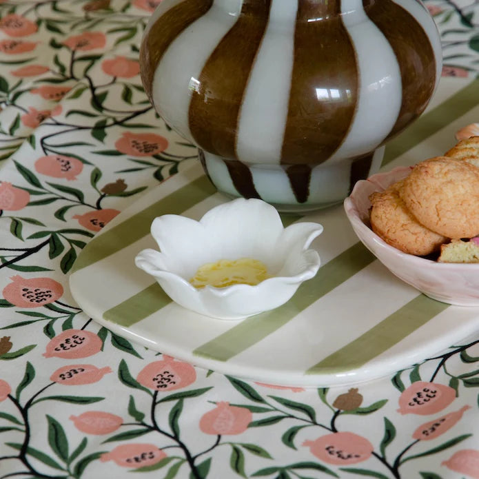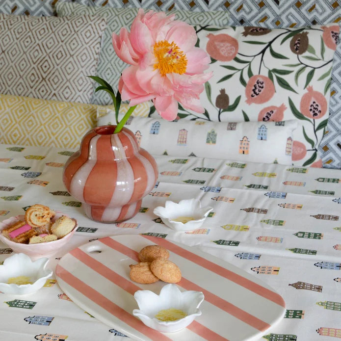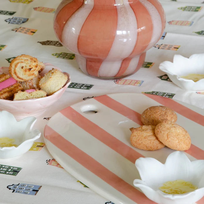 Een tafel die indruk maakt begint met de juiste details. Deze keramische snijplank in warme groen en oranje tinten met een speels gestreept patroon is niet alleen praktisch, maar ook een echte sfeermaker. Perfect om kazen, antipasti of zoetigheden stijlvol te presenteren, of gewoon als kleurrijke blikvanger op het aanrecht.
