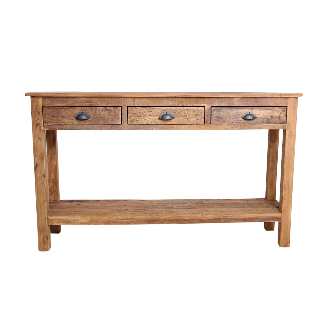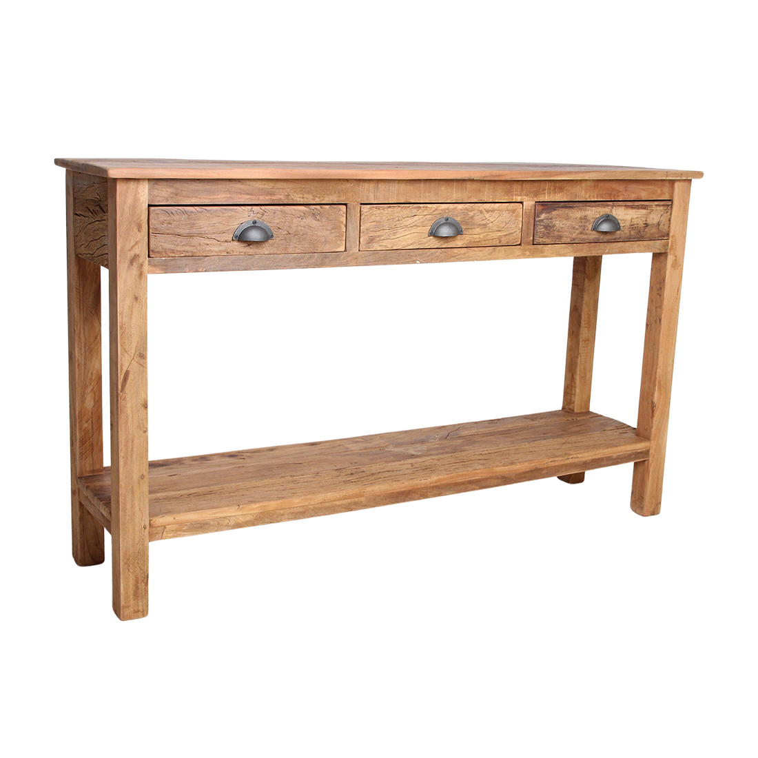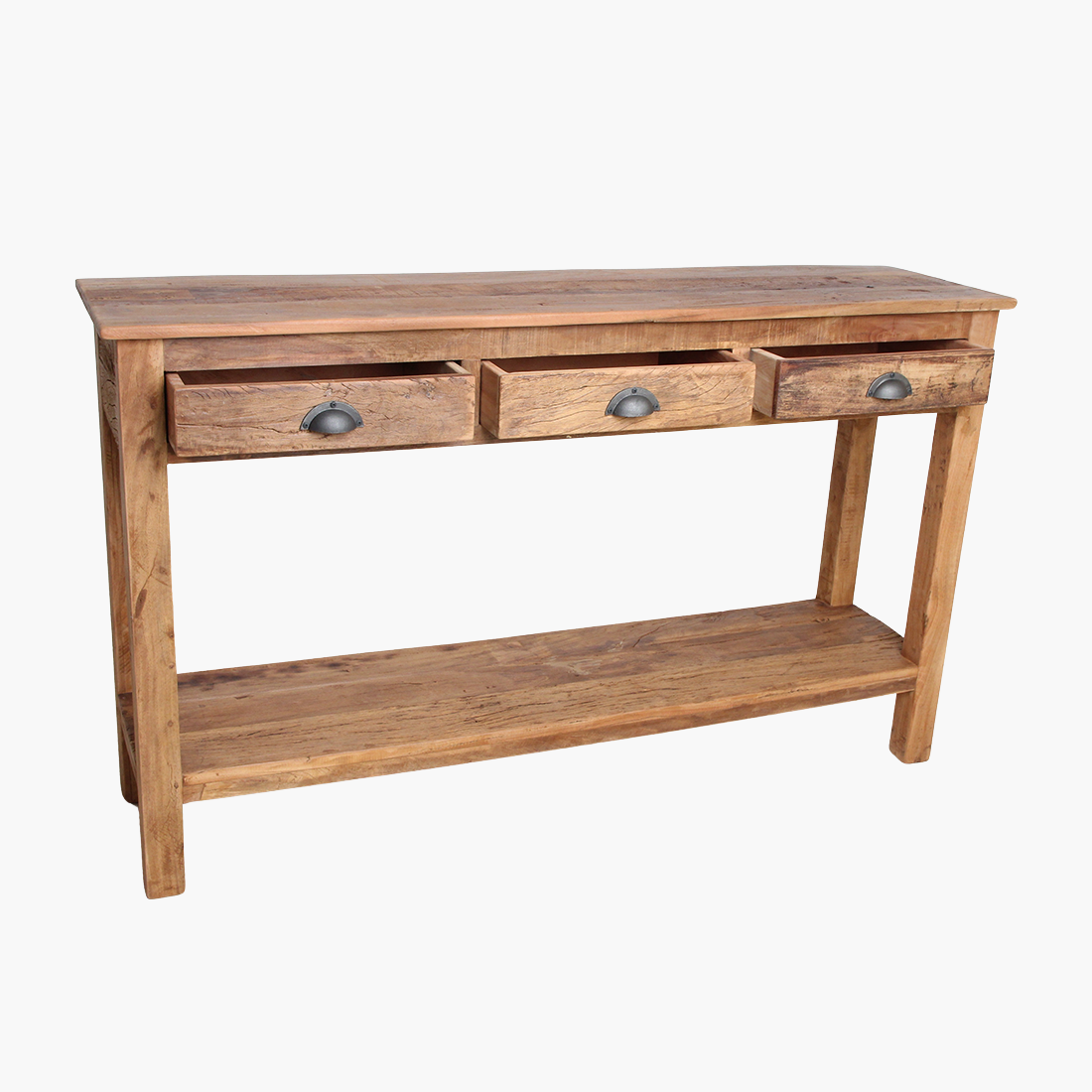 Landelijk dressoir (150×38×90 cm) uit Farmwood: handgemaakt van FSC-gecertificeerd gerecycled hout met unieke rustieke uitstraling (zichtbare noesten en scheuren). Drie lades, ruime opberging en onderhoudsvriendelijk. Duurzame keuze door verantwoord hergebruik van teruggewonnen balken — karaktervol en perfect te combineren met de Farmwood-collectie.