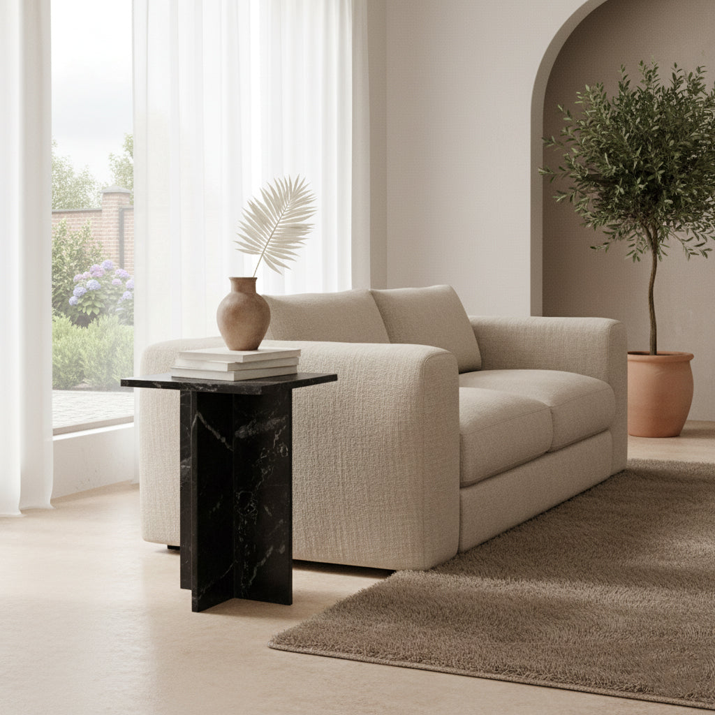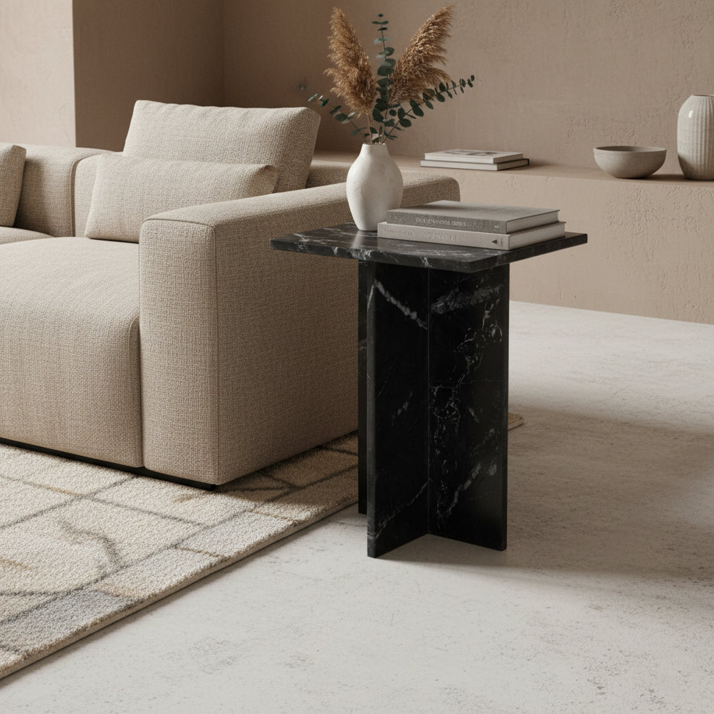 Shanghai bijzettafel - vierkant, volledig uitgevoerd in zwart marmer met kruisvormig onderstel. Modern, karaktervol design; elk exemplaar uniek door natuurlijke tekening. Ideaal als bijzet-, plant- of salontafel; combineert fraai met lichte en industriële interieurs. Ook leverbaar in wit (Beijing) en gemêleerd (Seoel).