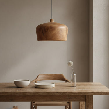 Sirocco Dome hanglamp — massief duurzaam Indonesisch teakhout. Strakke, ronde vorm voor warme, natuurlijke sfeer boven eettafel of zithoek. Verkrijgbaar als Dome en Bottle, ideaal te combineren. Duurzaam en uniek in nerf; eenvoudig te onderhouden met droge of lichtvochtige doek.