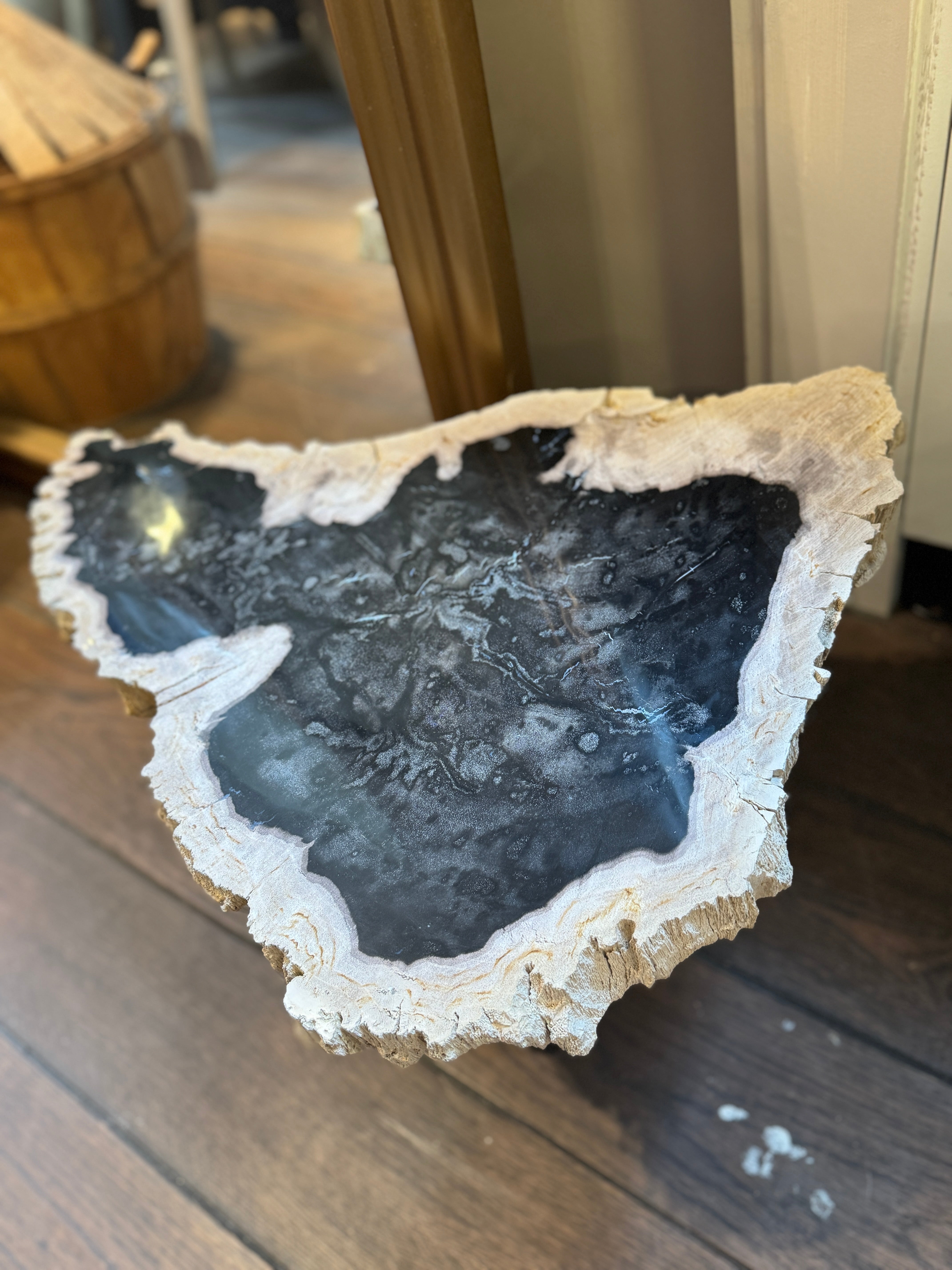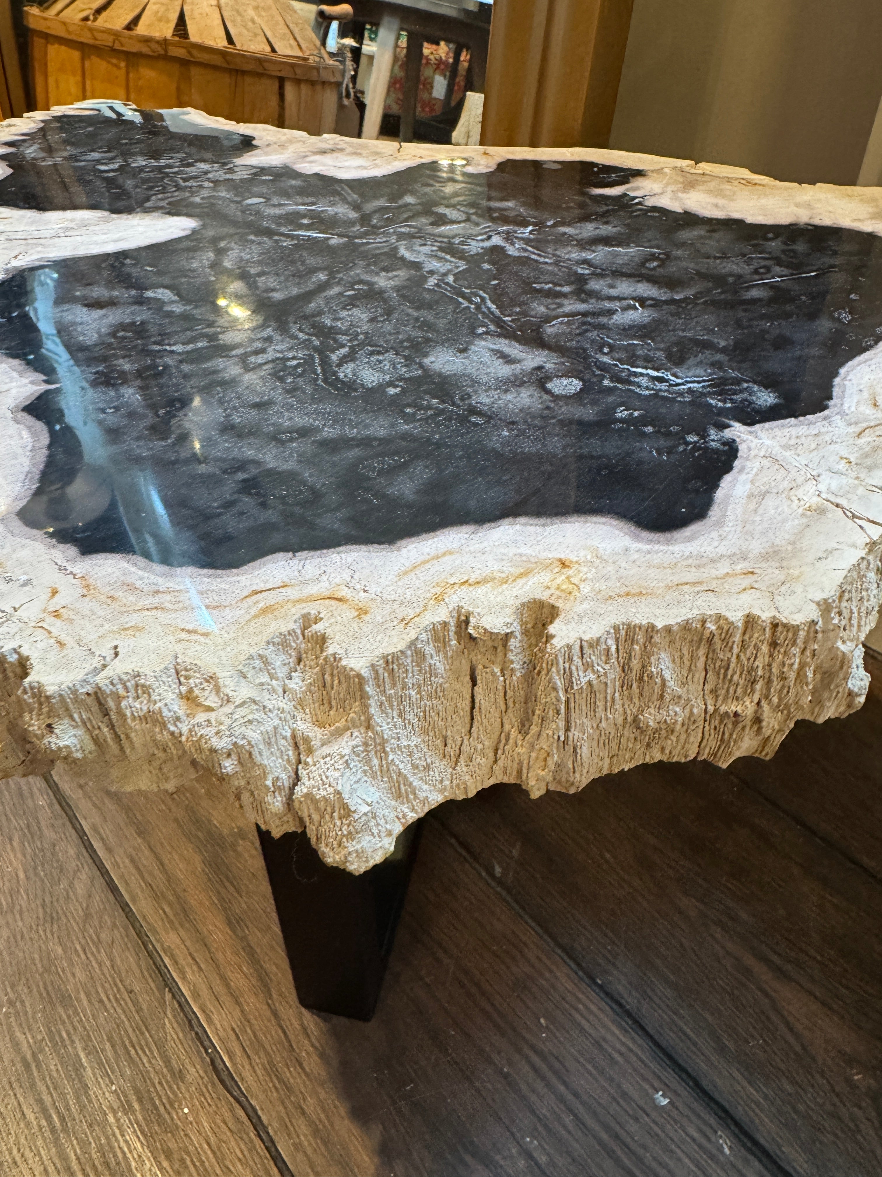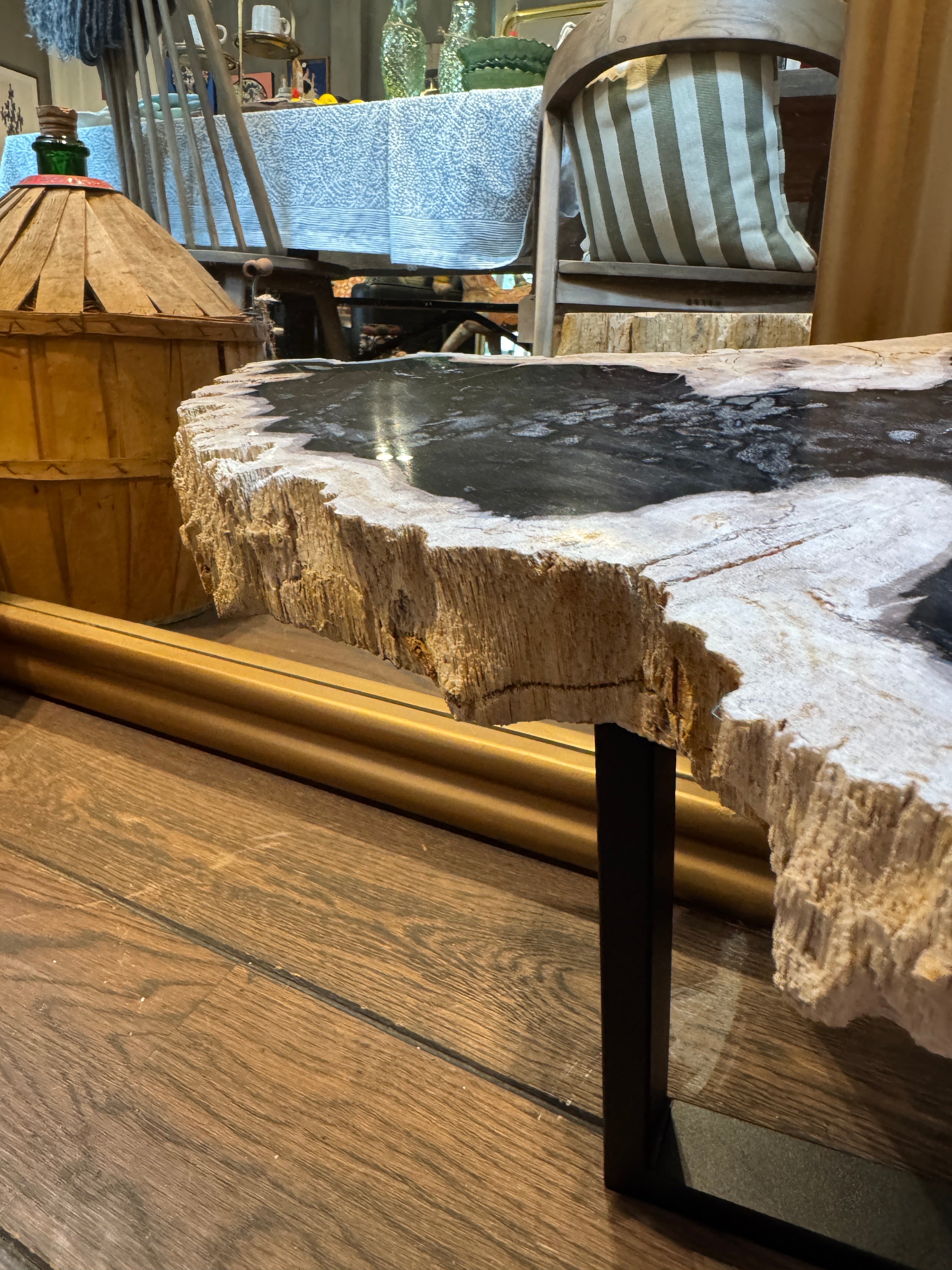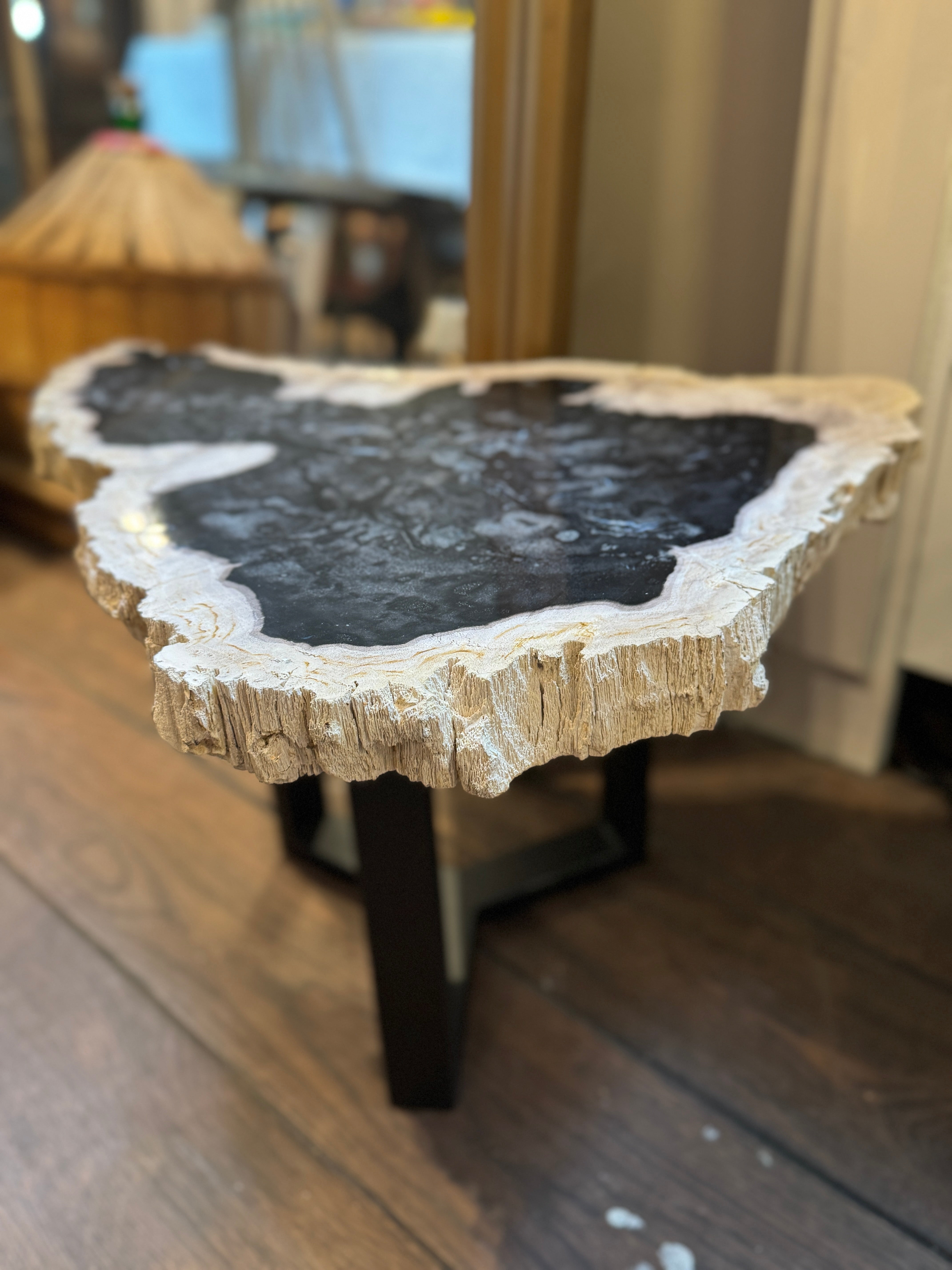 Een tafel die miljoenen jaren geleden begon als een majestueuze boom in een prehistorisch landschap. Nu, getransformeerd tot een fascinerend stuk versteend hout, brengt deze bijzettafel een uniek verhaal en natuurlijke luxe in jouw interieur.